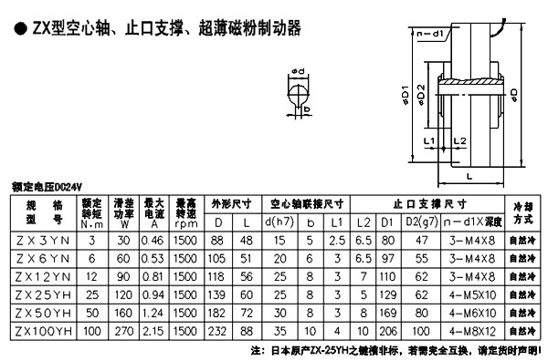 ZX型空心軸止口支撐超薄磁粉制動器型號標準參照日本三菱電機ZX-YN型產品、ZX-YH型產品。